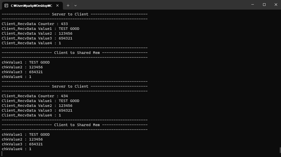 클라이언트는 카운터 필드를 증가시키고 ServerRequest 구조의 Value5 및 Value6 필드를 설정합니다. connect() 함수를 사용하여 서버에 연결하고, send() 함수를 사용하여 ServerRequest 구조를 보내고, recv() 함수를 사용하여 서버에서 clientRecv 구조로 데이터를 수신합니다.