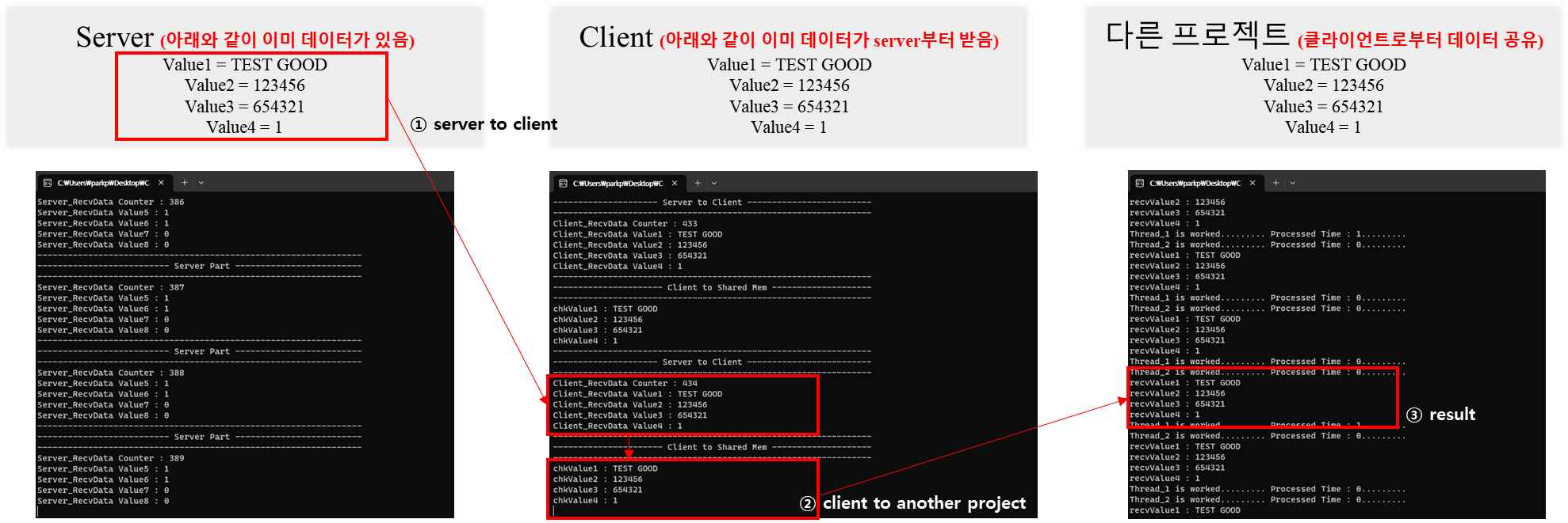 클라이언트는 4개의 공유 메모리 핸들 HanValue1, HanValue2, HanValue3 및 HanValue4를 열고 로컬 변수 chkValue1, chkValue2, chkValue3 및 chkValue4에 매핑합니다.